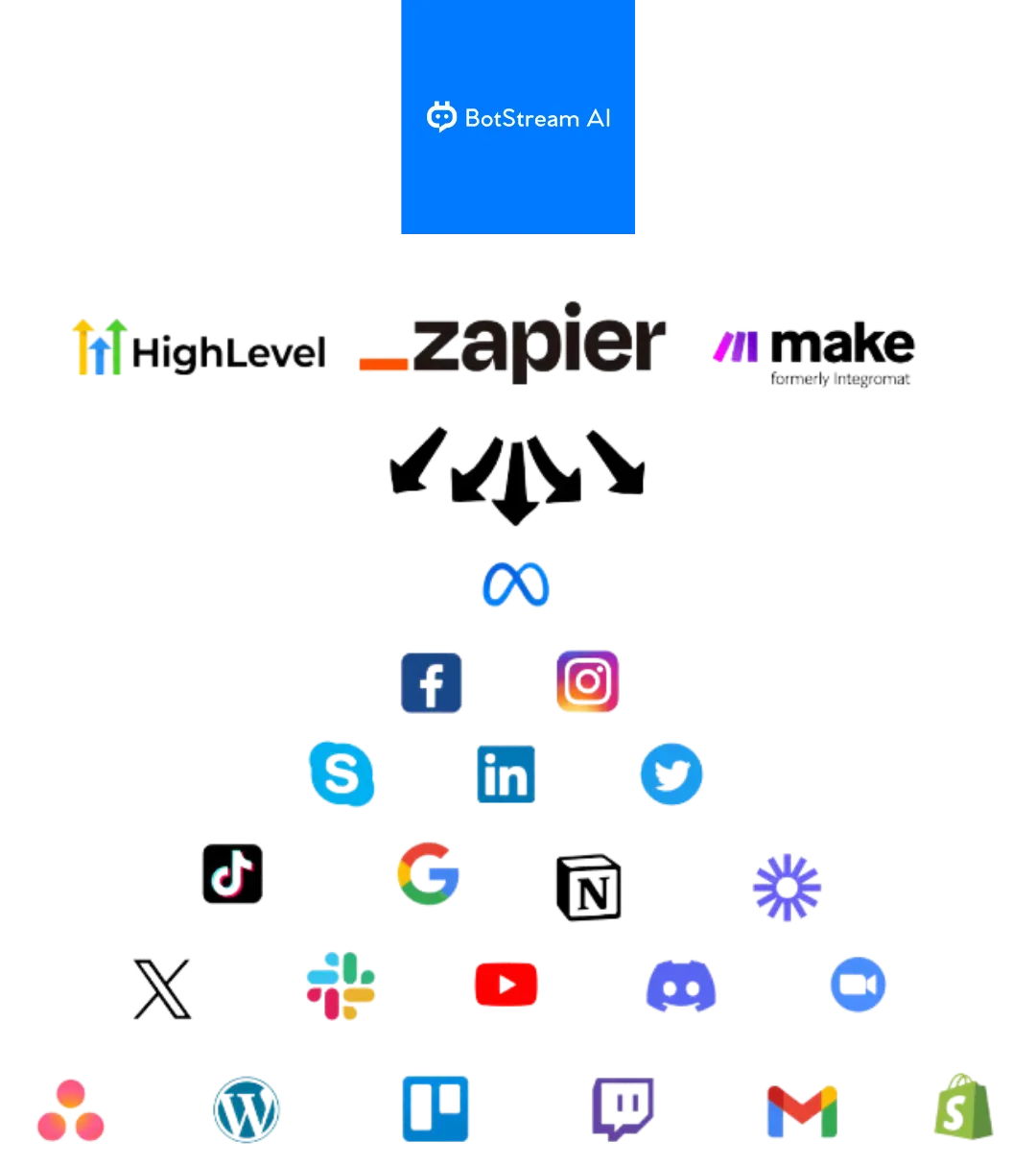 Olvídese de sistemas frágiles pegados con alambres. BotStream AI centraliza toda la potencia de IA en un solo lugar, con conexiones nativas a