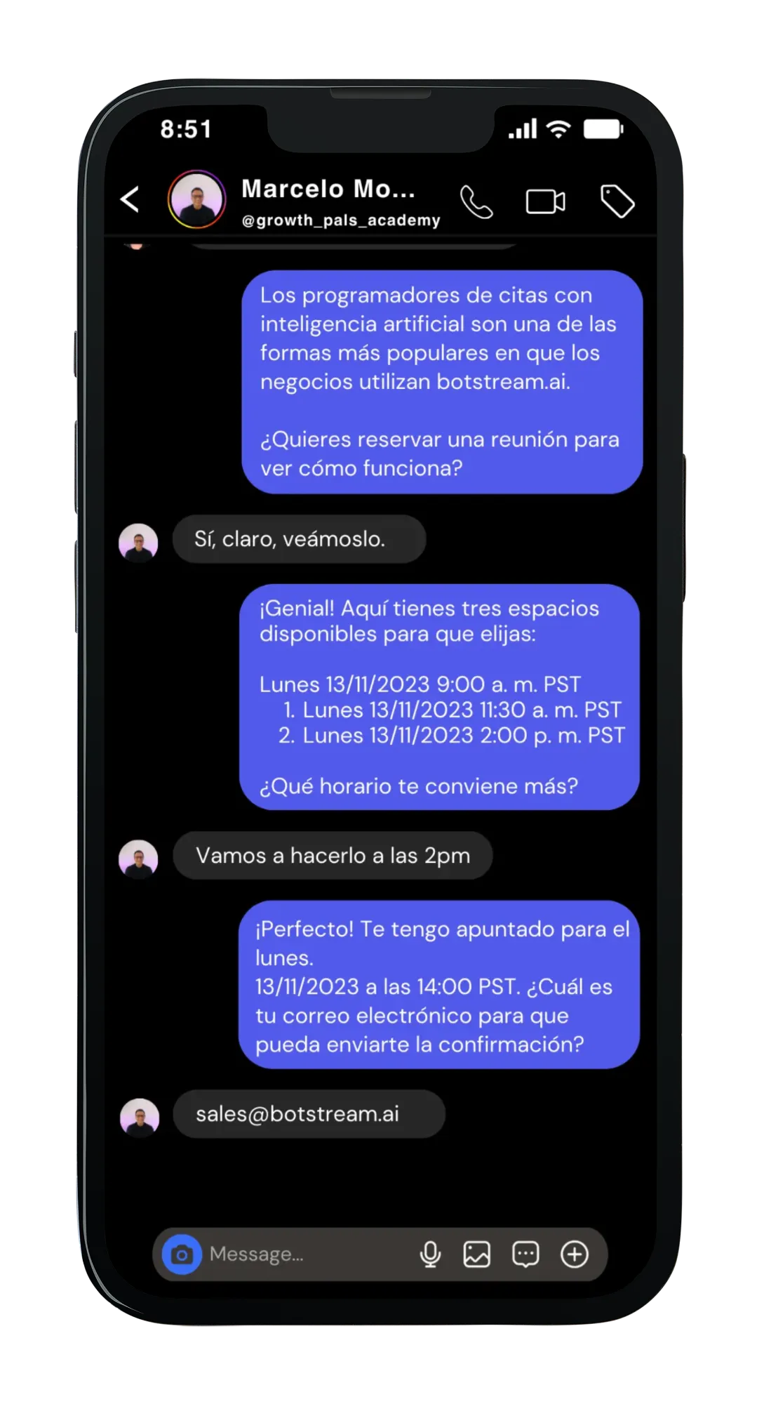 Tu IA trabaja como tu mejor SDR: consulta disponibilidad, propone horarios, envía confirmaciones y recordatorios automáticos. Todo sincronizado con Google Calendar, Outlook o Calendly.